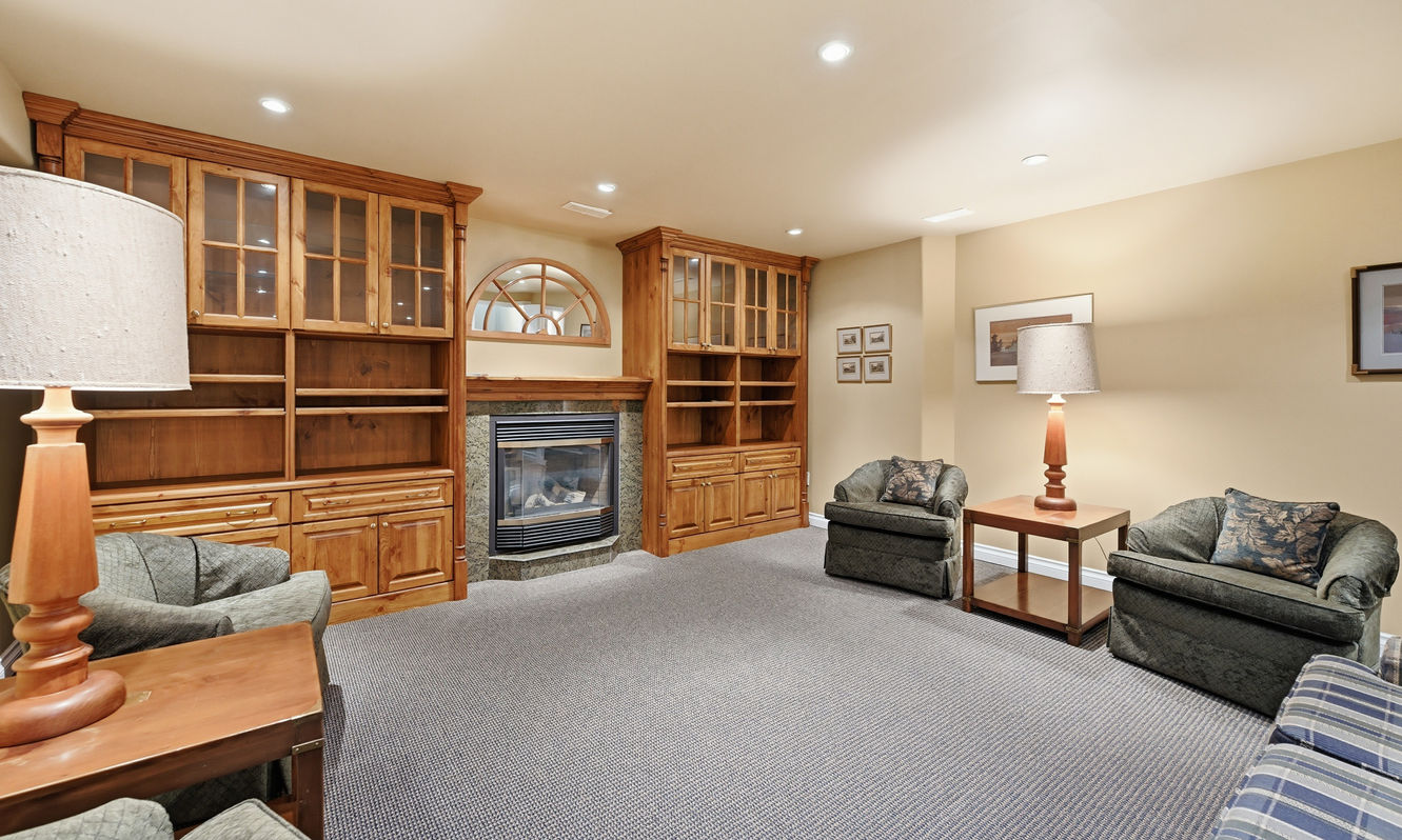 The fully finished lower level adds over 1,300 sq ft of flexible living space, including a large family room with custom solid pine built-ins and a second gas fireplace, a recreation room, dedicated home office, full bathroom, and a library or potential fourth bedroom with a walk-in closet.