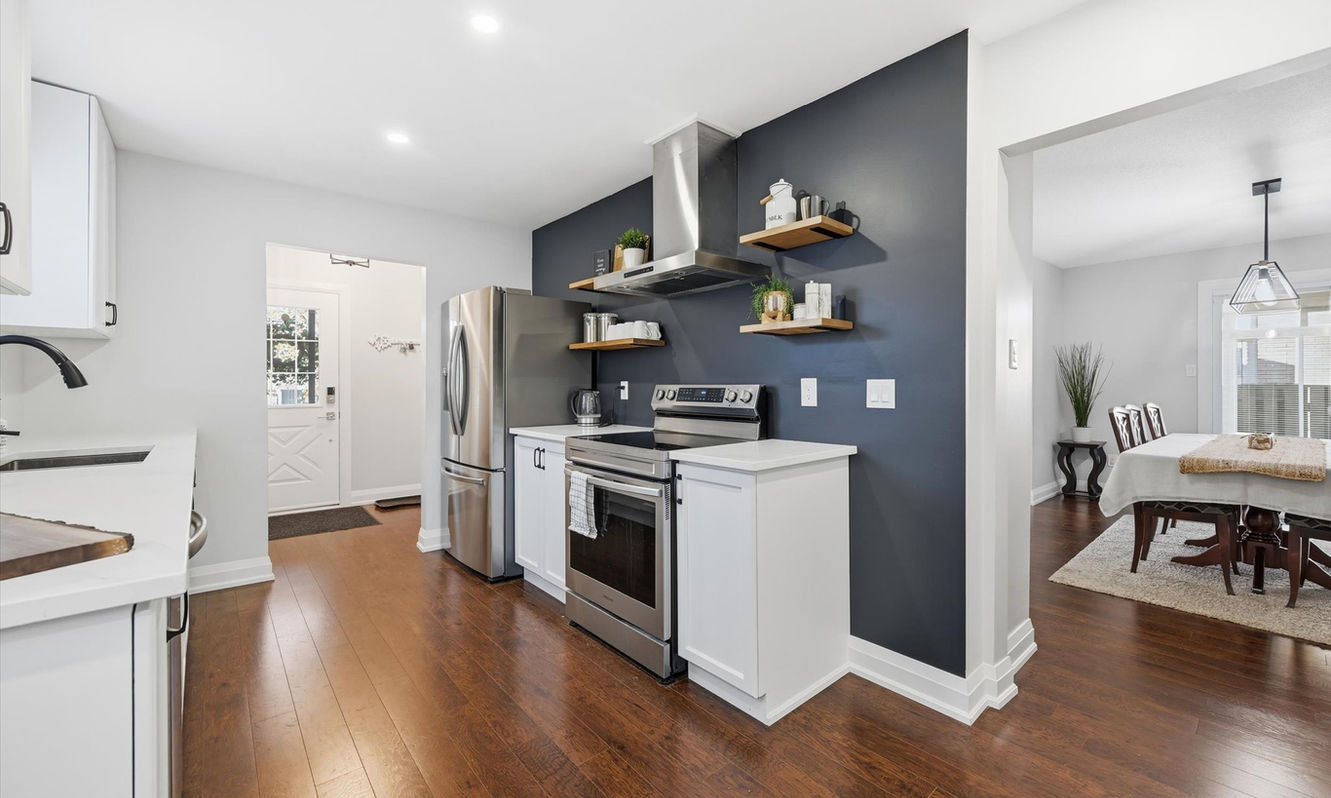 The bright living room welcomes you with a stunning feature wall and a large bow window that fills the space with natural light. Upstairs, three comfortable bedrooms and an updated 5-piece bathroom provide the perfect space for family living.