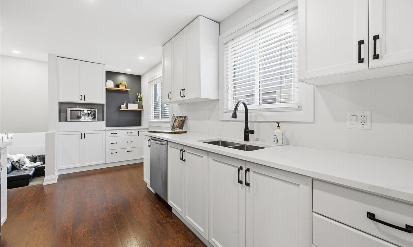 At the heart of the home is the renovated kitchen (2022), thoughtfully designed for both style and function with quartz countertops, an undermount double sink, open wood shelving, and a convenient serving area that flows seamlessly into the dining room. The adjoining dining space features a built-in bar nook and sliding doors leading to a charming 3-season sunroom (14' x 12'), perfect for morning coffee or evening wine. From here, you’ll find direct access to the garage and a handy walk-up from the lower level — an ideal setup for a future in-law suite or private living area.